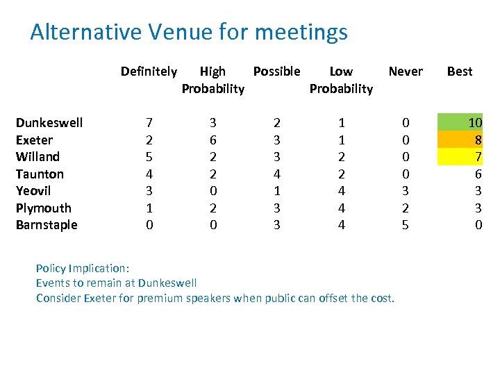 Alternative Venue for meetings Definitely Dunkeswell Exeter Willand Taunton Yeovil Plymouth Barnstaple 7 2 5 4 3 1 0 High Possible Low Probability 3 6 2 2 0 2 3 3 4 1 3 3 Never 1 1 2 2 4 4 4 Policy Implication: Events to remain at Dunkeswell Consider Exeter for premium speakers when public can offset the cost. 0 0 3 2 5 Best 10 8 7 6 3 3 0