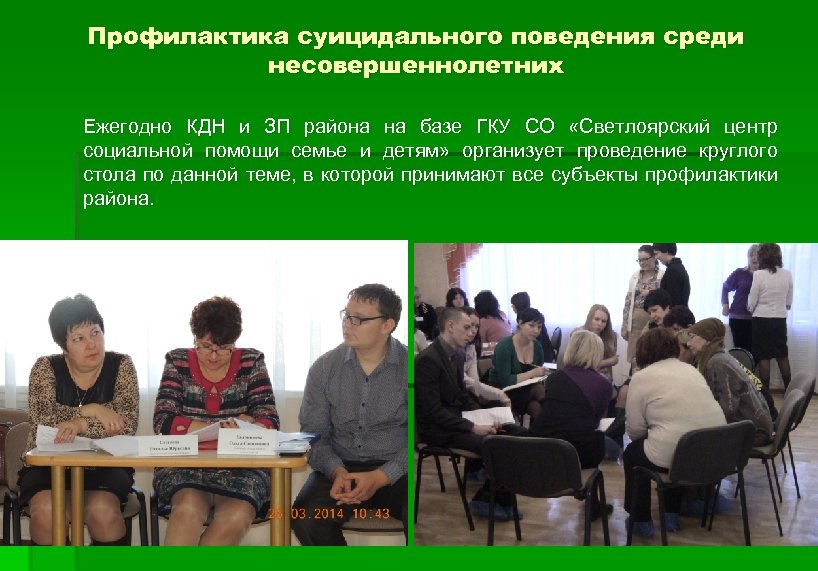 Профилактика суицидального поведения среди несовершеннолетних Ежегодно КДН и ЗП района на базе ГКУ СО «Светлоярский центр социальной помощи семье и детям» организует проведение круглого стола по данной теме, в которой принимают все субъекты профилактики района.
