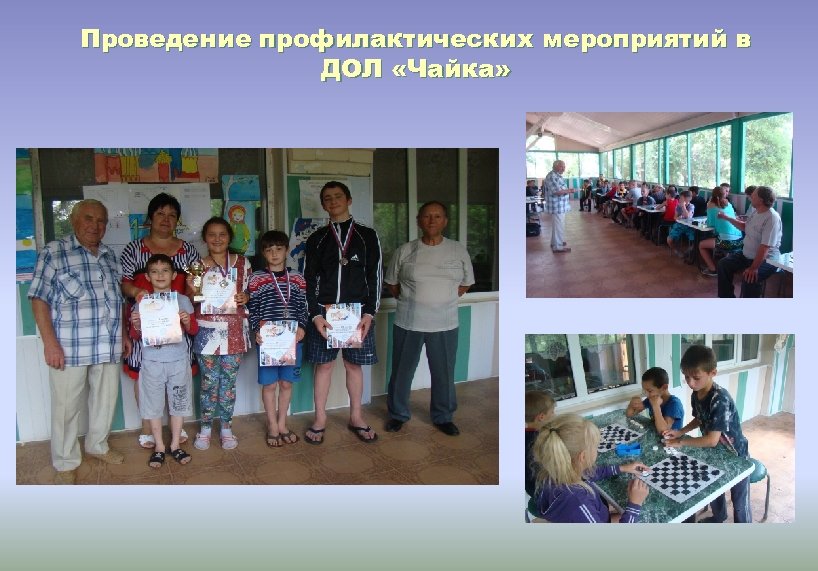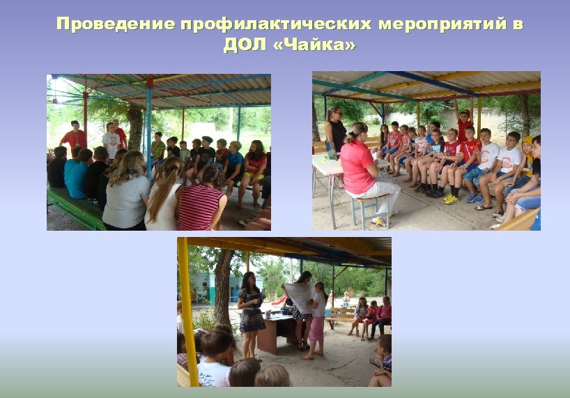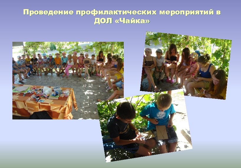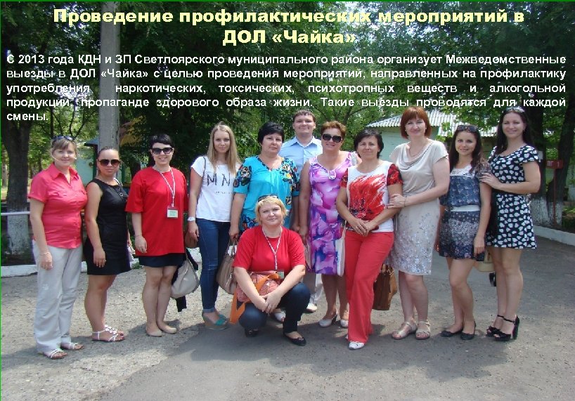 Проведение профилактических мероприятий в ДОЛ «Чайка» С 2013 года КДН и ЗП Светлоярского муниципального района организует Межведомственные выезды в ДОЛ «Чайка» с целью проведения мероприятий, направленных на профилактику употребления наркотических, токсических, психотропных веществ и алкогольной продукции, пропаганде здорового образа жизни. Такие выезды проводятся для каждой смены.