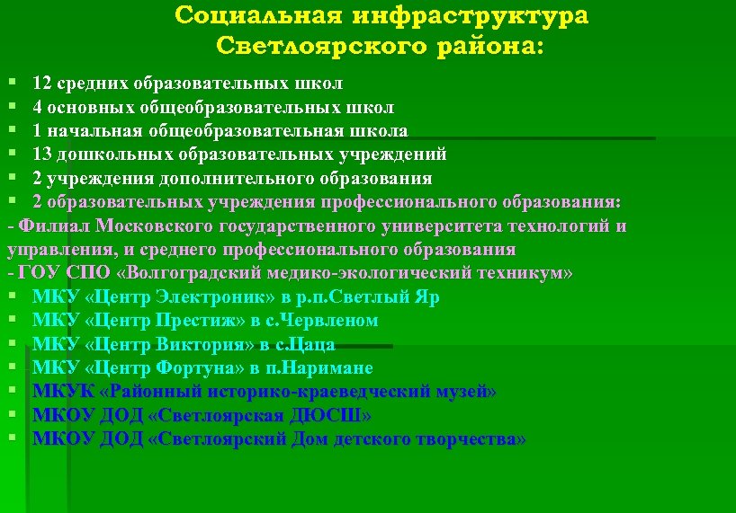 Социальная инфраструктура Светлоярского района: § 12 средних образовательных школ § 4 основных общеобразовательных школ § 1 начальная общеобразовательная школа § 13 дошкольных образовательных учреждений § 2 учреждения дополнительного образования § 2 образовательных учреждения профессионального образования: - Филиал Московского государственного университета технологий и управления, и среднего профессионального образования - ГОУ СПО «Волгоградский медико-экологический техникум» § МКУ «Центр Электроник» в р. п. Светлый Яр § МКУ «Центр Престиж» в с. Червленом § МКУ «Центр Виктория» в с. Цаца § МКУ «Центр Фортуна» в п. Наримане § МКУК «Районный историко-краеведческий музей» § МКОУ ДОД «Светлоярская ДЮСШ» § МКОУ ДОД «Светлоярский Дом детского творчества»