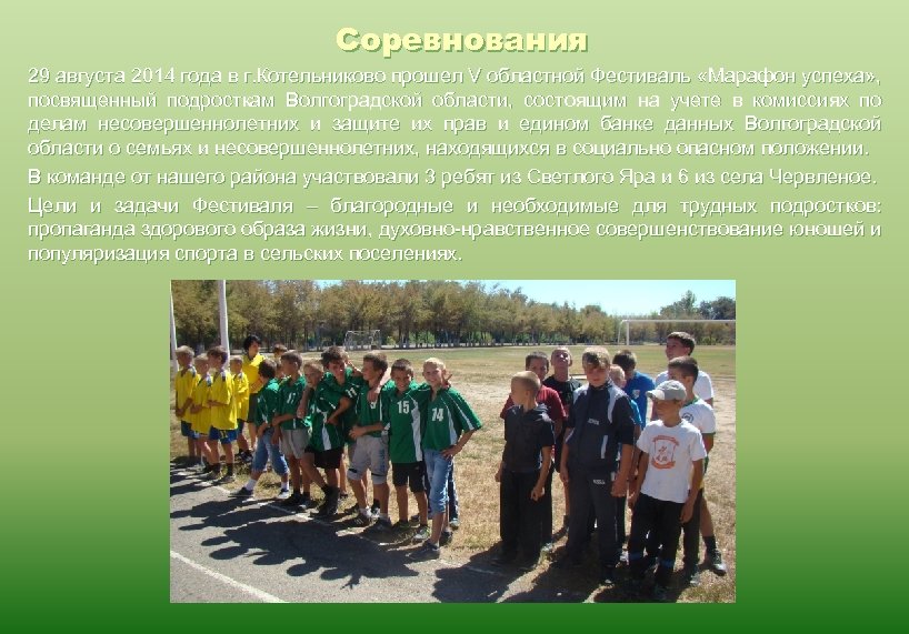 Соревнования 29 августа 2014 года в г. Котельниково прошел V областной Фестиваль «Марафон успеха» , посвященный подросткам Волгоградской области, состоящим на учете в комиссиях по делам несовершеннолетних и защите их прав и едином банке данных Волгоградской области о семьях и несовершеннолетних, находящихся в социально опасном положении. В команде от нашего района участвовали 3 ребят из Светлого Яра и 6 из села Червленое. Цели и задачи Фестиваля – благородные и необходимые для трудных подростков: пропаганда здорового образа жизни, духовно-нравственное совершенствование юношей и популяризация спорта в сельских поселениях.