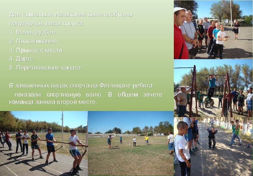 Для «силовых» испытаний были отобраны популярные виды спорта: 1. Мини-футбол 2. Подтягивание 3. Прыжок с места 4. Дартс 5. Перетягивание каната В заявленных видах спорта на Фестивале ребята показали спортивную волю. В общем зачете команда заняла второе место.