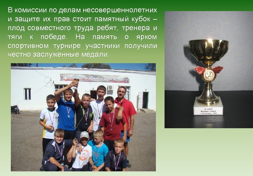 В комиссии по делам несовершеннолетних и защите их прав стоит памятный кубок – плод совместного труда ребят, тренера и тяги к победе. На память о ярком спортивном турнире участники получили честно заслуженные медали.