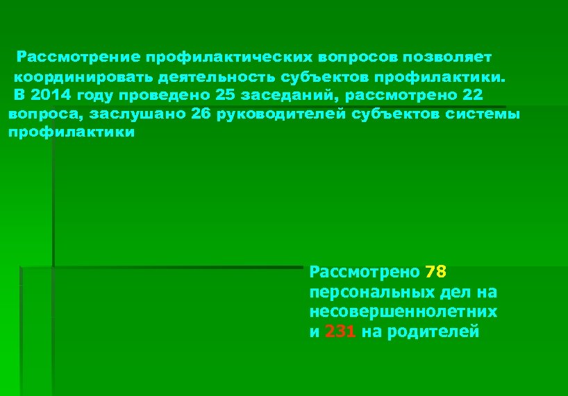 Рассмотрение профилактических вопросов позволяет координировать деятельность субъектов профилактики. В 2014 году проведено 25 заседаний, рассмотрено 22 вопроса, заслушано 26 руководителей субъектов системы профилактики Рассмотрено 78 персональных дел на несовершеннолетних и 231 на родителей