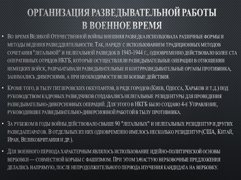 Организация разведывательной работы в военное время Во время Великой Отечественной войны внешняя разведка использовала различные формы и методы ведения разведдеятельности. Так, наряду с использованием традиционных методов сочетания "легальной" и нелегальной разведок в 1943-1944 г., одновременно действовало более ста оперативных отрядов НКГБ, которые осуществляли разведывательные операции в отношении немецких войск, разрабатывали разведывательные и контрразведывательные органы противника, занимались диверсиями, а при необходимости вели боевые действия. Кроме того, в тылу гитлеровских оккупантов, в ряде городов (Киев, Одесса, Харьков и т.д.) под руководством кадровых разведчиков создавались нелегальные резидентуры для проведения разведывательно-диверсионных операций. Для этого в НКГБ было создано 4-е Управление, руководившее разведывательно-диверсионной работой в тылу противника. За рубежом в годы войны действовало свыше 90 "легальных" и нелегальных резидентур и других разведаппаратов. В отдельных из них одновременно имелось несколько резидентур (США, Китай, Иран, Великобритания и др.). Для военного периода характерным являлось использование идейно-политической основы вербовки — совместной борьбы с фашизмом. При этом зачастую вербовочные предложения делались напрямую, после непродолжительного периода изучения кандидата на вербовку.