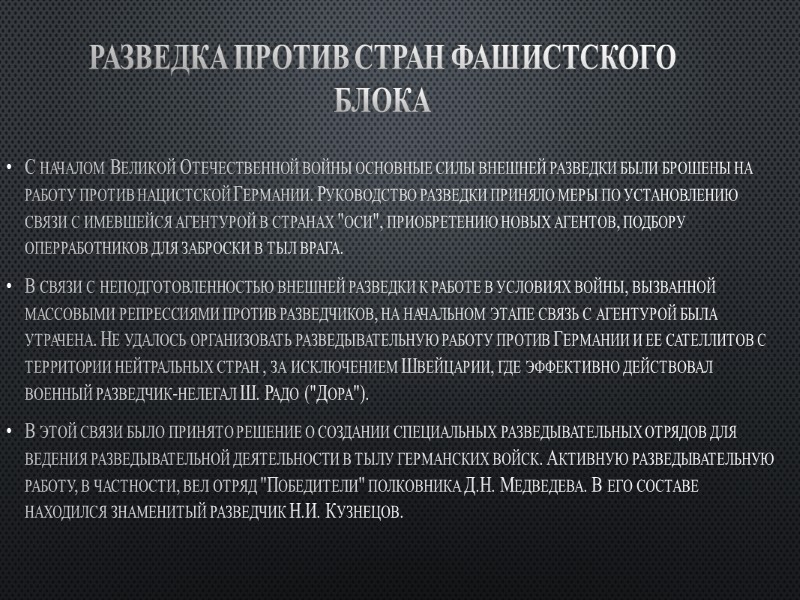 Разведка против стран фашистского блока С началом Великой Отечественной войны основные силы внешней разведки были брошены на работу против нацистской Германии. Руководство разведки приняло меры по установлению связи с имевшейся агентурой в странах "оси", приобретению новых агентов, подбору оперработников для заброски в тыл врага. В связи с неподготовленностью внешней разведки к работе в условиях войны, вызванной массовыми репрессиями против разведчиков, на начальном этапе связь с агентурой была утрачена. Не удалось организовать разведывательную работу против Германии и ее сателлитов с территории нейтральных стран , за исключением Швейцарии, где эффективно действовал военный разведчик-нелегал Ш. Радо ("Дора"). В этой связи было принято решение о создании специальных разведывательных отрядов для ведения разведывательной деятельности в тылу германских войск. Активную разведывательную работу, в частности, вел отряд "Победители" полковника Д.Н. Медведева. В его составе находился знаменитый разведчик Н.И. Кузнецов.