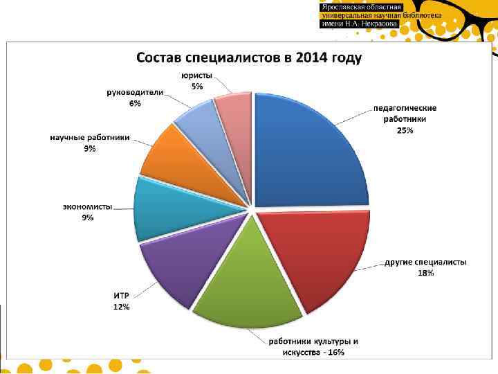 Библиотечные кадры Количество штатных единиц – 130, 5 На 01. 2015 в библиотеке имелось 5 вакансий библиотечных специалистов Высшее образование – 99 человек, из них 25 – библиотечное Среднее профессиональное – 23, из них 16 – библиотечное 8 сотрудников учатся в ВУЗах (из них 2 получают высшее библиотечное образование), 7 сотрудников учится в Ярославском училище культуры, 3 сотрудника в отчетном году закончили ЯУК