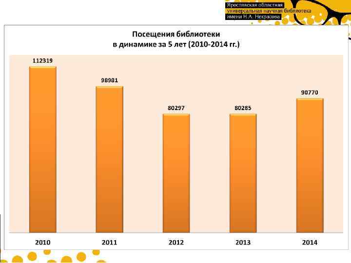 Средние показатели 2014 года • библиотека была открыта для читателей 295 дней • среднее число посещений в день – 308 человека • средняя выдача документов в день – 1571 экз. • средняя выдача документов на одно посещение – 5, 1 экз. • читаемость – 31 • посещаемость – 6, 1 • обращаемость – 0, 36