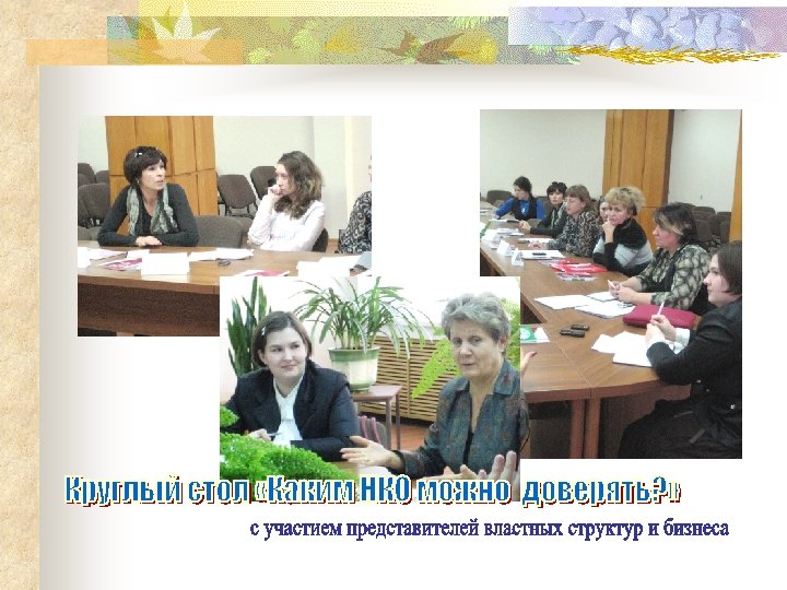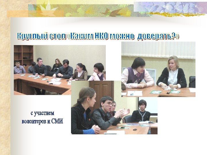 Проект «Развитие прозрачности некоммерческого сектора. Улучшение информирования внешних заинтересованных сторон о его деятельности» n n Проект осуществлялся совместно с «Агентством социальной информации» в партнерстве с Общественной палатой Ульяновской области и независимым политклубом «Третий сектор» В рамках проекта было проведено 4 круглых стола с представителями бизнеса, органов власти, СМИ, клиентами и волонтерами НКО, самими НКО и читателями новостей АСИ с целью определить, что является доказательством того, что некоммерческая организация заслуживает доверия. По итогам этих встреч были разработаны рекомендации для НКО по прозрачности и доверию к ним. А также выработаны наиболее актуальные, с точки зрения читателей, аспекты развития как федеральной, так и региональной ленты новостей АСИ. Презентация результатов проекта прошла в Москве на координационной встрече АСИ. Деятельность по проекту была широко освещена в СМИ