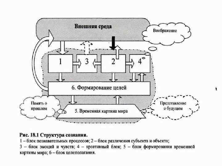 СТРУКТУРА СОЗНАНИЯ ЧЕЛОВЕКА Сознание человека – это сформированная в процессе общественной жизни высшая форма психического отражения действительности в виде обобщенной и субъективной модели окружающего мира в форме словесных понятий и чувственных образов. Признаки сознания: речь, мышление и способность создавать обобщенную модель окружающего мира в виде совокупности образов и понятий. Структура сознания: 1. Познавательные процессы 2. Различение субъекта и объекта 3. Отношения человеку к себе и окружающему миру 4. Креативная, составляющая 5. Формирование временной картины мира 6. Формирование целей деятельности
