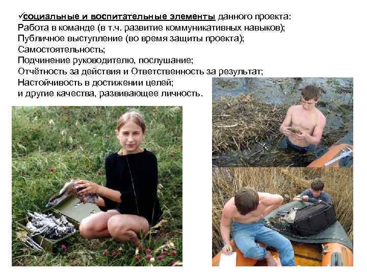 üсоциальные и воспитательные элементы данного проекта: Работа в команде (в т. ч. развитие коммуникативных навыков); Публичное выступление (во время защиты проекта); Самостоятельность; Подчинение руководителю, послушание; Отчётность за действия и Ответственность за результат; Настойчивость в достижении целей; и другие качества, развивающее личность.