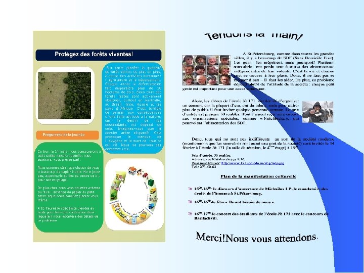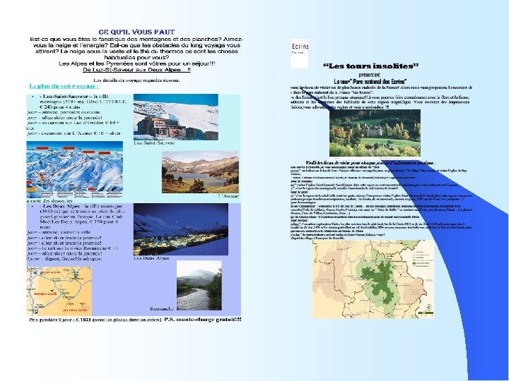FICHE DU PROJET « PROPOSER UN ITINERAIRE D’UN VOYAGE A TRAVERS LA FRANCE » Classe de 9 e Objectifs du projet : Réalisation d’un itinéraire de voyage de 5 à 7 jours à travers la France (une région, un département, une ville) ayant pour but la découverte des lieux liés au patrimoine historique et culturel, ou présentant la richesse de la nature du pays, ou son actualité. Pour proposer et décrire cet itinéraire vous recherez des informations dans des livres, des périodiques, sur Internet en triant des renseignements utiles. L’itinéraire se présente sous la forme d’un programme qui inclut la conception (l’objectif) du voyage imaginaire (sur les traces d’un personnage célèbre, d’un événement historique, d’un personnage littéraire, d’un écrivain…, d’un plat ou produit traditionnel, d’une tradition – le Tour de France, festivals, fête, d’un style artistique ou architectural…, des secteurs d’économie…. . . ) - un paragraphe • La description des lieux et des activités de chaque jour de voyage, des possibilités d’hébergement et de déplacement d’un endroit vers un autre. • 2 -3 images, une carte peuvent illustrer votre production. Vous réaliserez un Flyer du format A 4 en utilisant le traitement de texte (WORD) N’oubliez pas de noter les sources d’information utilisées.