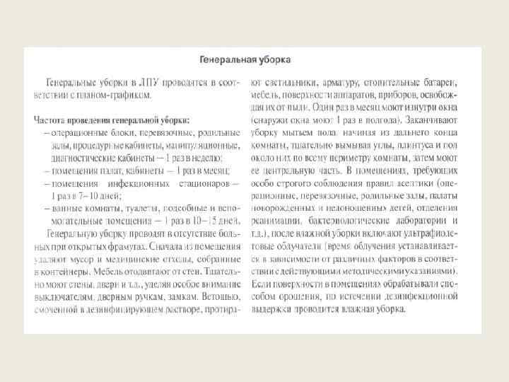Цель дезинфекции: удаление и уничтожение микроорганизмов на объектах внешней среды палат и функциональных подразделений ЛПУ, медицинском оборудовании и инструментарии для предотвращения заражения пациентов и персонала Дезинфекции подлежат все изделия медицинского назначения после их применения В качестве средств дезинфекции, предстерилизационной очистки и стерилизации используются только разрешенные в установленном порядке физические и химические средства.