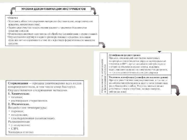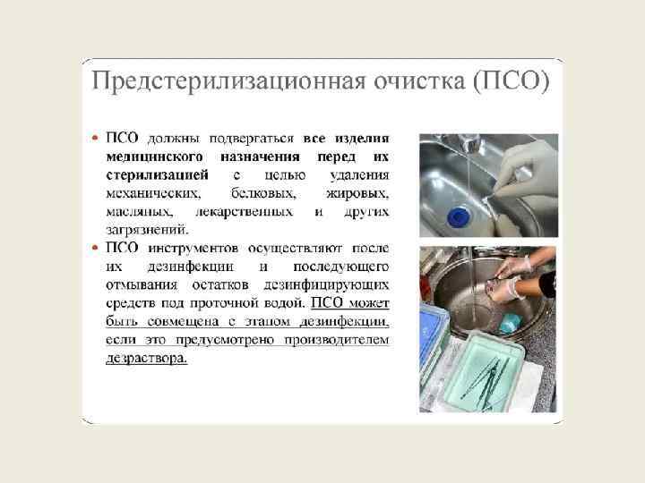 Стерилизация — метод, обеспечивающий гибель в стерилизуемом материале вегетативных и споровых форм патогенных и непатогенных микроорганизмов. Стерилизации должны подвергаться все предметы или отдельные виды диагностической аппаратуры, соприкасающиеся с раной, кровью, инъекционными препаратами, с поврежденными слизистыми оболочками. Изделия, подлежащие стерилизации, обрабатывают в несколько этапов: очистка, дезинфекция, предстерилизационная очистка, стерилизация. В современных лечебных учреждения организованы централизованные стерилизационные отделения (ЦСО), в которых проводят: • предстерилизационную обработку медицинского инструментария; • стерилизацию: изделий медицинского назначения; белья и перевязочного материала. В то же время существует и децентрализованная (непосредственно в отделении) система предстерилизационной обработки и стерилизации.