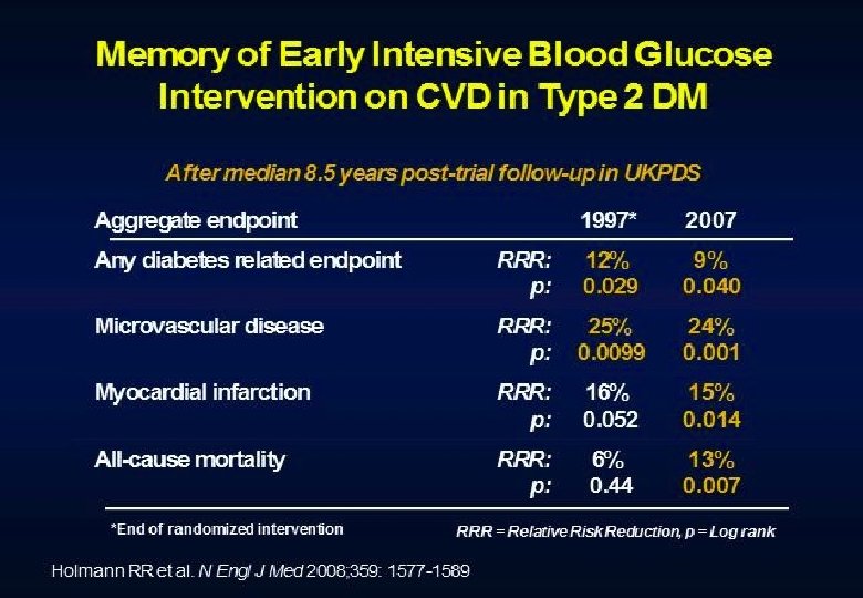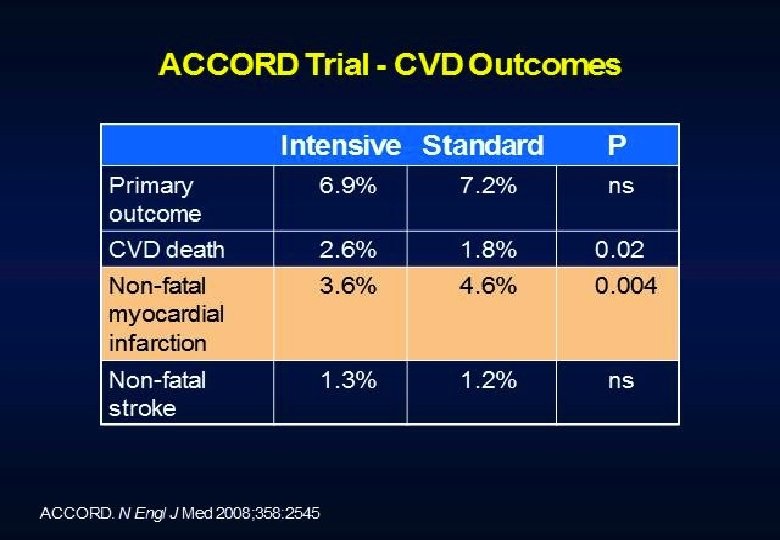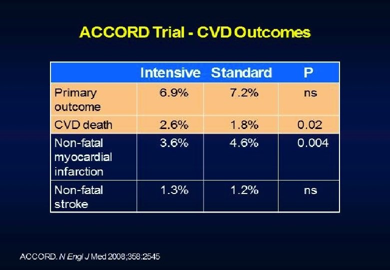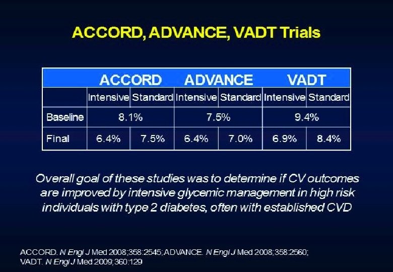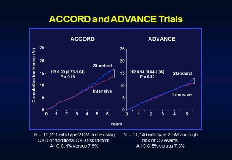 Conclusions Intensive treatment of glycemia in the ACCORD cohort did not reduce the risk of composite measures of advanced microvascular outcomes renal failure: initiation of dialysis or ESRD, or renal transplant, or a rise of serum creatinine above 3. 3 mg/d. L retinal photocoagulation or vitrectomy to treat diabetic retinopathy, or development of neuropathy Intensive therapy delayed the onset of albuminuria and some measures of eye complications and neuropathy Microvascular benefits of intensive therapy should be weighed against increase in total and CVD-related mortality, increased weight gain, and high risk for severe hypoglycemia