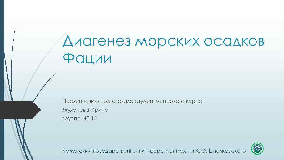 Диагенез морских осадков Фации Презентацию подготовила студентка первого курса Муханова Ирина группа ИЕ-13 Калужский государственный университет имени К. Э. Циолковского