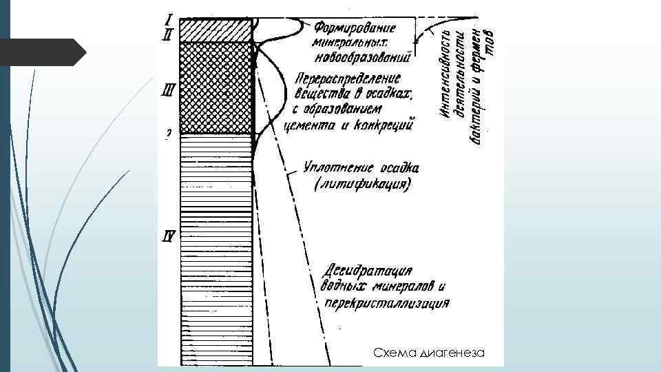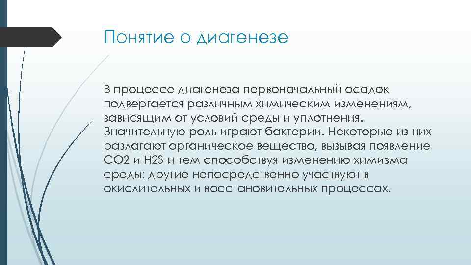 Понятие о диагенезе В процессе диагенеза первоначальный осадок подвергается различным химическим изменениям, зависящим от условий среды и уплотнения. Значительную роль играют бактерии. Некоторые из них разлагают органическое вещество, вызывая появление СО 2 и H 2 S и тем способствуя изменению химизма среды; другие непосредственно участвуют в окислительных и восстановительных процессах.