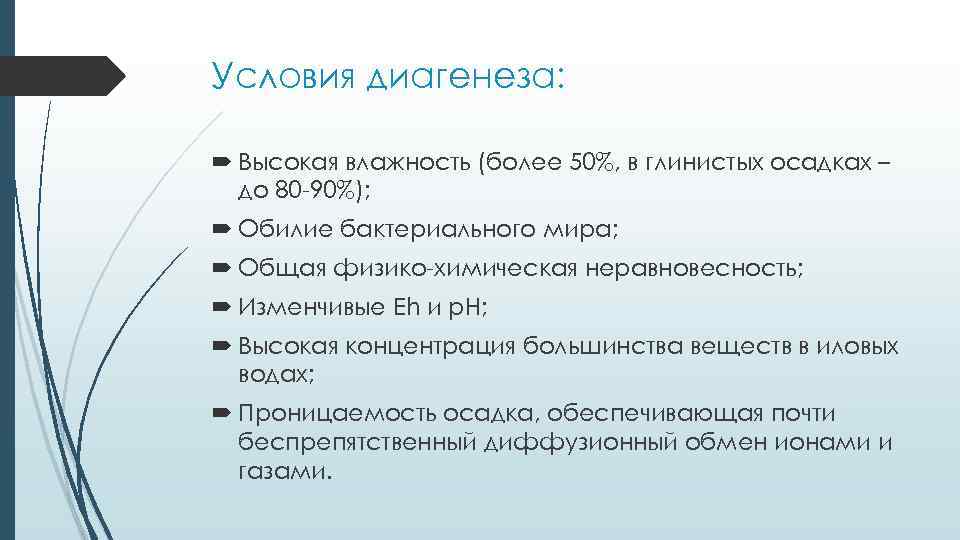 Условия диагенеза: Высокая влажность (более 50%, в глинистых осадках – до 80 -90%); Обилие бактериального мира; Общая физико-химическая неравновесность; Изменчивые Еh и р. Н; Высокая концентрация большинства веществ в иловых водах; Проницаемость осадка, обеспечивающая почти беспрепятственный диффузионный обмен ионами и газами.