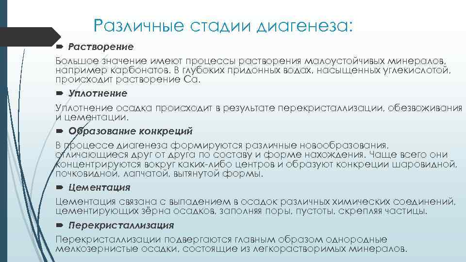 Различные стадии диагенеза: Растворение Большое значение имеют процессы растворения малоустойчивых минералов, например карбонатов. В глубоких придонных водах, насыщенных углекислотой, происходит растворение Са. Уплотнение осадка происходит в результате перекристаллизации, обезвоживания и цементации. Образование конкреций В процессе диагенеза формируются различные новообразования, отличающиеся друг от друга по составу и форме нахождения. Чаще всего они концентрируются вокруг каких-либо центров и образуют конкреции шаровидной, почковидной, лапчатой, вытянутой формы. Цементация связана с выпадением в осадок различных химических соединений, цементирующих зёрна осадков, заполняя поры, пустоты, скрепляя частицы. Перекристаллизация Перекристаллизации подвергаются главным образом однородные мелкозернистые осадки, состоящие из легкорастворимых минералов.