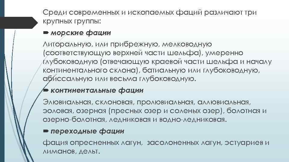 Среди современных и ископаемых фаций различают три крупных группы: морские фации Литоральную, или прибрежную, мелководную (соответствующую верхней части шельфа), умеренно глубоководную (отвечающую краевой части шельфа и началу континентального склона), батиальную или глубоководную, абиссальную или весьма глубоководную. континентальные фации Элювиальная, склоновая, пролювиальная, аллювиальная, эоловая, озерная (пресных озер и соленых озер), болотная и озерно-болотная, ледниковая и водно-ледниковая. переходные фации фация опресненных лагун, засолоненных лагун, эстуариев и лиманов, дельт.