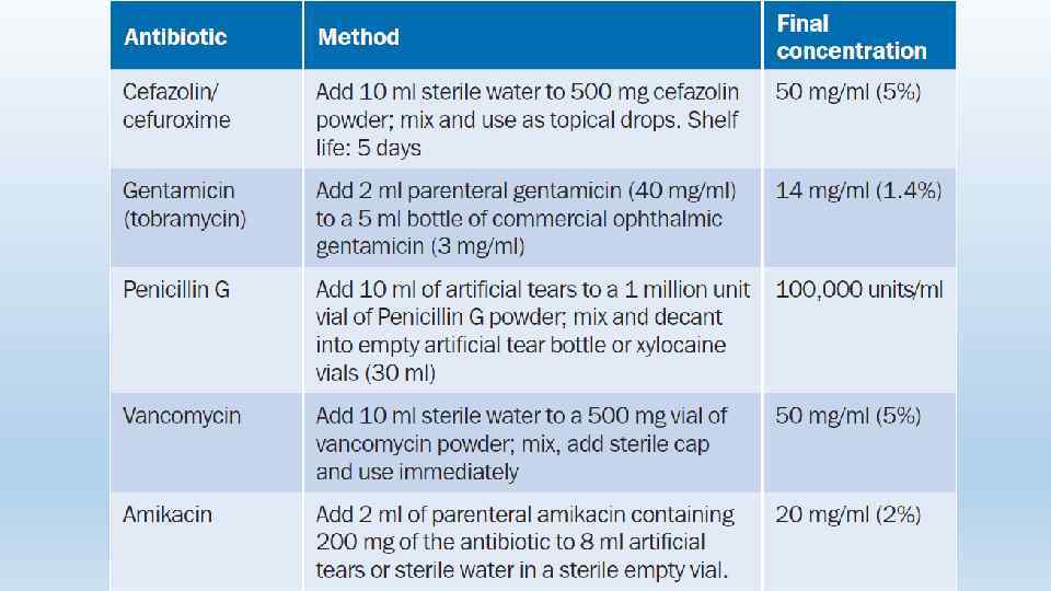 При отсутствии грибкового поражения Антибактериальные препараты q. Cefazolinum (Цефазолин) 5% и Гентамицин 1, 4% ИЛИ q. Ciprofloxacinum (Флоксимед/Цилоксан) 0, 3% или Ofloxacinum (Унифлокс) 0, 3% 1 к к/час