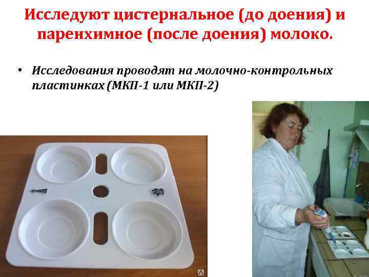 Исследуют цистернальное (до доения) и паренхимное (после доения) молоко. • Исследования проводят на молочно-контрольных пластинках (МКП-1 или МКП-2)