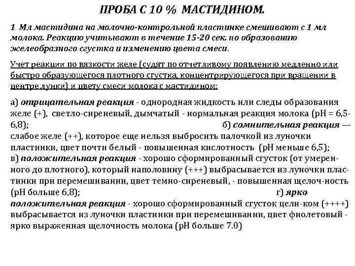 ПРОБА С 10 % МАСТИДИНОМ. 1 Мл мастидина на молочно-контрольной пластинке смешивают с 1 мл молока. Реакцию учитывают в течение 15 -20 сек. по образованию желеобразного сгустка и изменению цвета смеси. Учет реакции по вязкости желе (судят по отчетливому появлению медленно или быстро образующегося плотного сгустка, концентрирующегося при вращении в центре лунки) и цвету смеси молока с мастидином: а) отрицательная реакция - однородная жидкость или следы образования реакция желе (+), светло-сиреневый, дымчатый - нормальная реакция молока (р. Н = 6, 56, 8); б) сомнительная реакция — реакция слабое желе (++), которое еще нельзя выбросить палочкой из луночки пластинки, цвет почти белый - повышенная кислотность (р. Н меньше 6, 5); в) положительная реакция - хорошо сформированный сгусток (от умеренреакция ного до плотного), который наполовину (+++) выбрасывается из луночки пластинки при перемешивании, цвет темно-сиреневый, - повышенная щелоч-ность (р. Н больше 6, 8); г) ярко положительная реакция - хорошо сформированный сгусток цели-ком (++++) реакция выбрасывается из луночки пластинки при перемешивании, цвет фиолетовый - ярко выраженная щелочность молока (р. Н больше 7. 0)