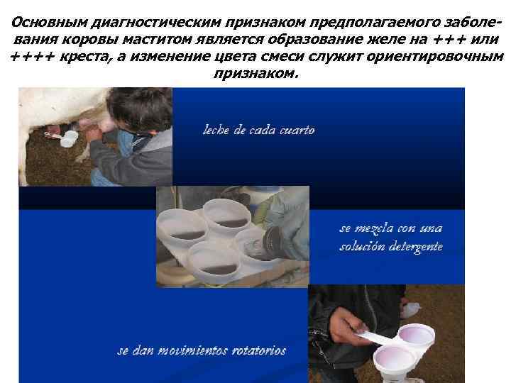 Основным диагностическим признаком предполагаемого заболевания коровы маститом является образование желе на +++ или ++++ креста, а изменение цвета смеси служит ориентировочным признаком.