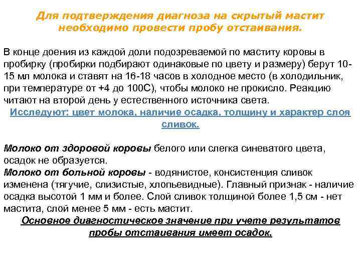 Для подтверждения диагноза на скрытый мастит необходимо провести пробу отстаивания. В конце доения из каждой доли подозреваемой по маститу коровы в пробирку (пробирки подбирают одинаковые по цвету и размеру) берут 1015 мл молока и ставят на 16 -18 часов в холодное место (в холодильник, при температуре от +4 до 100 С), чтобы молоко не прокисло. Реакцию читают на второй день у естественного источника света. Исследуют: цвет молока, наличие осадка, толщину и характер слоя сливок. Молоко от здоровой коровы белого или слегка синеватого цвета, осадок не образуется. Молоко от больной коровы - водянистое, консистенция сливок изменена (тягучие, слизистые, хлопьевидные). Главный признак - наличие осадка высотой 1 мм и более. Слой сливок толщиной более 1, 5 см - нет мастита, слой менее 5 мм - есть мастит. Основное диагностическое значение при учете результатов пробы отстаивания имеет осадок.