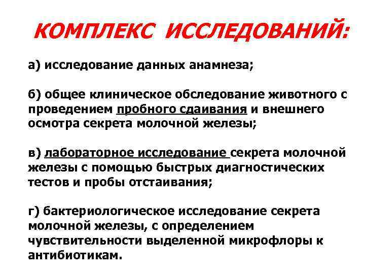 КОМПЛЕКС ИССЛЕДОВАНИЙ: а) исследование данных анамнеза; б) общее клиническое обследование животного с проведением пробного сдаивания и внешнего осмотра секрета молочной железы; в) лабораторное исследование секрета молочной железы с помощью быстрых диагностических тестов и пробы отстаивания; г) бактериологическое исследование секрета молочной железы, с определением чувствительности выделенной микрофлоры к антибиотикам.
