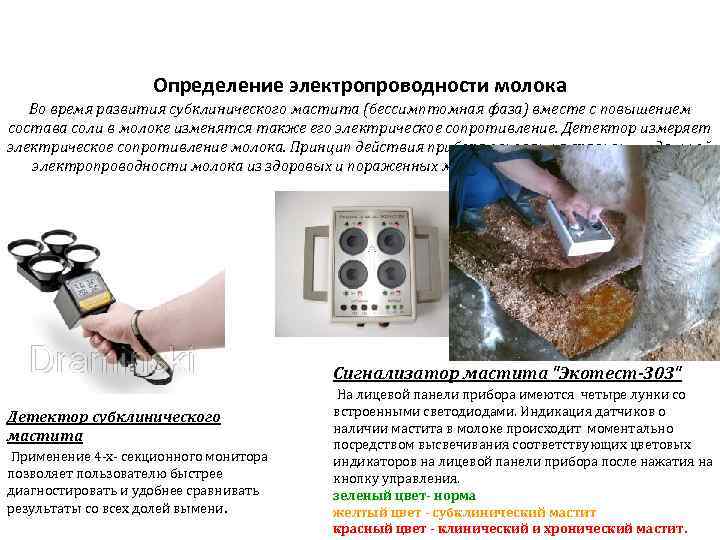 Определение электропроводности молока Во время развития субклинического мастита (бессимптомная фаза) вместе с повышением состава соли в молоке изменятся также его электрическое сопротивление. Детектор измеряет электрическое сопротивление молока. Принцип действия прибора основан на сравнении удельной электропроводности молока из здоровых и пораженных маститом долей вымени коровы. Сигнализатор мастита "Экотест-303" На лицевой панели прибора имеются четыре лунки со Детектор субклинического мастита Применение 4 -х- секционного монитора позволяет пользователю быстрее диагностировать и удобнее сравнивать результаты со всех долей вымени. встроенными светодиодами. Индикация датчиков о наличии мастита в молоке происходит моментально посредством высвечивания соответствующих цветовых индикаторов на лицевой панели прибора после нажатия на кнопку управления. зеленый цвет- норма желтый цвет - субклинический мастит красный цвет - клинический и хронический мастит.