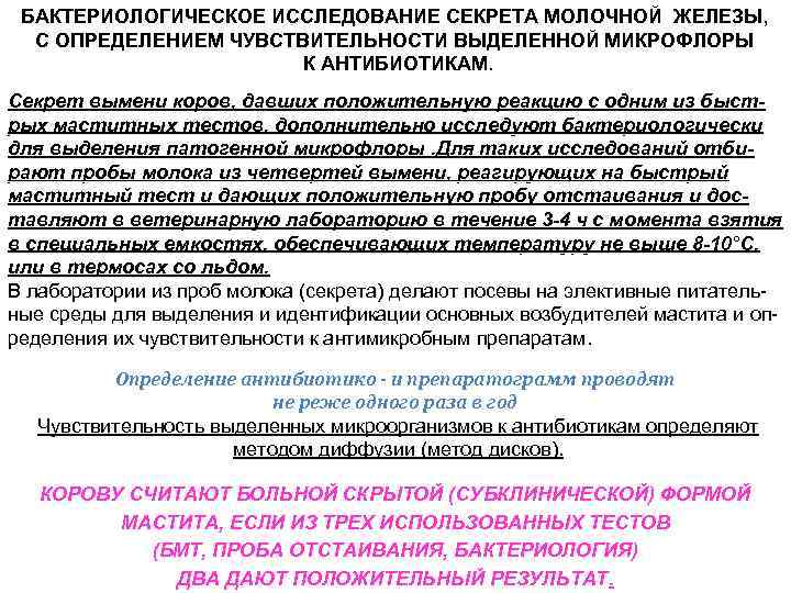 БАКТЕРИОЛОГИЧЕСКОЕ ИССЛЕДОВАНИЕ СЕКРЕТА МОЛОЧНОЙ ЖЕЛЕЗЫ, С ОПРЕДЕЛЕНИЕМ ЧУВСТВИТЕЛЬНОСТИ ВЫДЕЛЕННОЙ МИКРОФЛОРЫ К АНТИБИОТИКАМ. Секрет вымени коров, давших положительную реакцию с одним из быстрых маститных тестов, дополнительно исследуют бактериологически для выделения патогенной микрофлоры. Для таких исследований отбирают пробы молока из четвертей вымени, реагирующих на быстрый маститный тест и дающих положительную пробу отстаивания и доставляют в ветеринарную лабораторию в течение 3 -4 ч с момента взятия в специальных емкостях, обеспечивающих температуру не выше 8 -10°С, или в термосах со льдом. В лаборатории из проб молока (секрета) делают посевы на элективные питательные среды для выделения и идентификации основных возбудителей мастита и определения их чувствительности к антимикробным препаратам. Определение антибиотико - и препаратограмм проводят не реже одного раза в год Чувствительность выделенных микроорганизмов к антибиотикам определяют методом диффузии (метод дисков). КОРОВУ СЧИТАЮТ БОЛЬНОЙ СКРЫТОЙ (СУБКЛИНИЧЕСКОЙ) ФОРМОЙ МАСТИТА, ЕСЛИ ИЗ ТРЕХ ИСПОЛЬЗОВАННЫХ ТЕСТОВ (БМТ, ПРОБА ОТСТАИВАНИЯ, БАКТЕРИОЛОГИЯ) ДВА ДАЮТ ПОЛОЖИТЕЛЬНЫЙ РЕЗУЛЬТАТ.