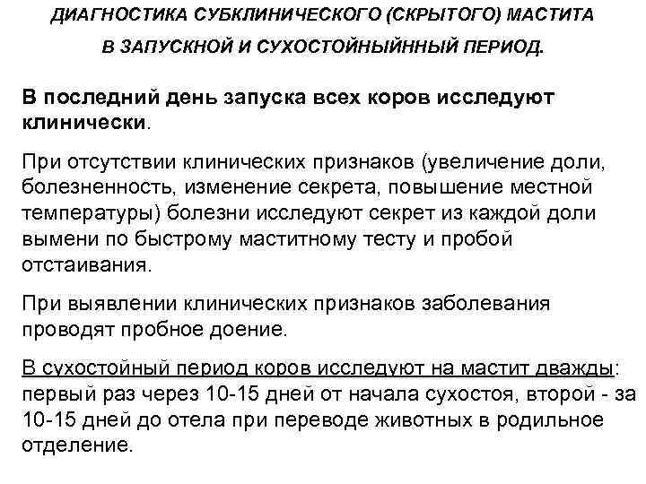 ДИАГНОСТИКА СУБКЛИНИЧЕСКОГО (СКРЫТОГО) МАСТИТА В ЗАПУСКНОЙ И СУХОСТОЙНЫЙННЫЙ ПЕРИОД. В последний день запуска всех коров исследуют клинически При отсутствии клинических признаков (увеличение доли, болезненность, изменение секрета, повышение местной температуры) болезни исследуют секрет из каждой доли вымени по быстрому маститному тесту и пробой отстаивания. При выявлении клинических признаков заболевания проводят пробное доение. В сухостойный период коров исследуют на мастит дважды: дважды первый раз через 10 -15 дней от начала сухостоя, второй - за 10 -15 дней до отела при переводе животных в родильное отделение.