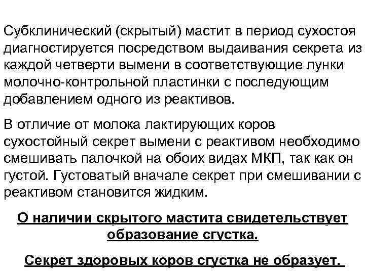 Субклинический (скрытый) мастит в период сухостоя диагностируется посредством выдаивания секрета из каждой четверти вымени в соответствующие лунки молочно-контрольной пластинки с последующим добавлением одного из реактивов. В отличие от молока лактирующих коров сухостойный секрет вымени с реактивом необходимо смешивать палочкой на обоих видах МКП, так как он густой. Густоватый вначале секрет при смешивании с реактивом становится жидким. О наличии скрытого мастита свидетельствует образование сгустка. Секрет здоровых коров сгустка не образует.