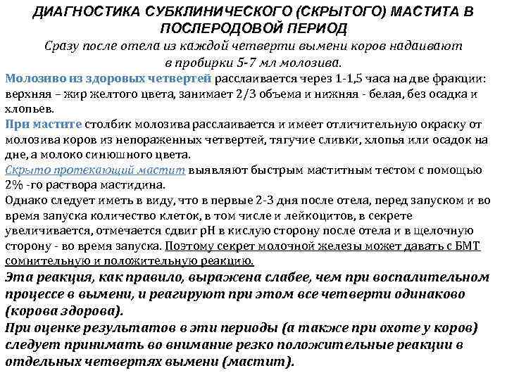ДИАГНОСТИКА СУБКЛИНИЧЕСКОГО (СКРЫТОГО) МАСТИТА В ПОСЛЕРОДОВОЙ ПЕРИОД Сразу после отела из каждой четверти вымени коров надаивают в пробирки 5 -7 мл молозива. Молозиво из здоровых четвертей расслаивается через 1 -1, 5 часа на две фракции: верхняя – жир желтого цвета, занимает 2/3 объема и нижняя - белая, без осадка и хлопьев. При мастите столбик молозива расслаивается и имеет отличительную окраску от молозива коров из непораженных четвертей, тягучие сливки, хлопья или осадок на дне, а молоко синюшного цвета. Скрыто протекающий мастит выявляют быстрым маститным тестом с помощью 2% -го раствора мастидина. Однако следует иметь в виду, что в первые 2 -3 дня после отела, перед запуском и во время запуска количество клеток, в том числе и лейкоцитов, в секрете увеличивается, отмечается сдвиг р. Н в кислую сторону после отела и в щелочную сторону - во время запуска. Поэтому секрет молочной железы может давать с БМТ сомнительную и положительную реакцию. Эта реакция, как правило, выражена слабее, чем при воспалительном процессе в вымени, и реагируют при этом все четверти одинаково (корова здорова). При оценке результатов в эти периоды (а также при охоте у коров) следует принимать во внимание резко положительные реакции в отдельных четвертях вымени (мастит).