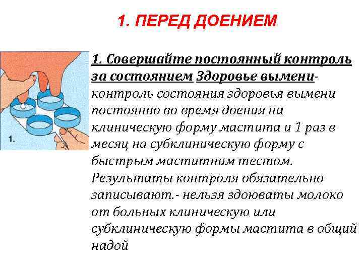 1. ПЕРЕД ДОЕНИЕМ 1. Совершайте постоянный контроль за состоянием Здоровье вымени- контроль состояния здоровья вымени постоянно во время доения на клиническую форму мастита и 1 раз в месяц на субклиническую форму с быстрым маститним тестом. Результаты контроля обязательно записывают. - нельзя здоюваты молоко от больных клиническую или субклиническую формы мастита в общий надой