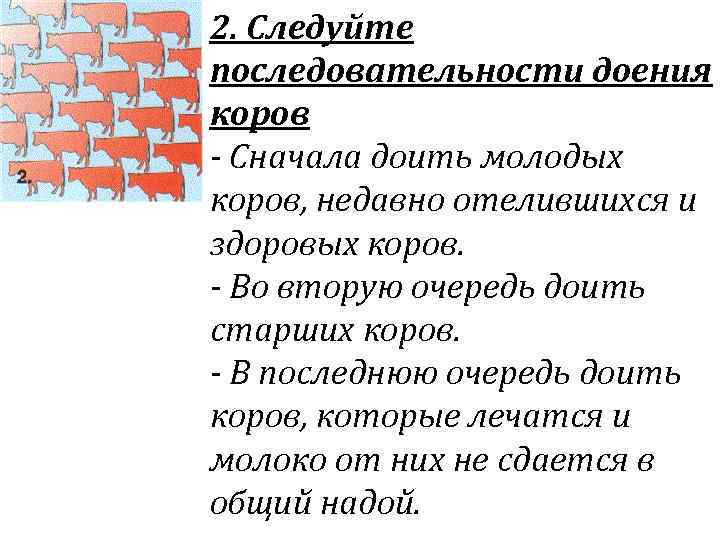 2. Следуйте последовательности доения коров - Сначала доить молодых коров, недавно отелившихся и здоровых коров. - Во вторую очередь доить старших коров. - В последнюю очередь доить коров, которые лечатся и молоко от них не сдается в общий надой.