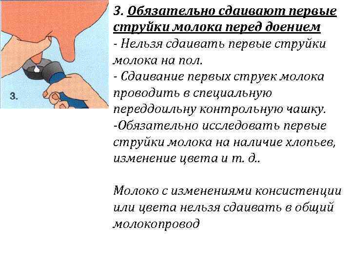 3. Обязательно сдаивают первые струйки молока перед доением - Нельзя сдаивать первые струйки молока на пол. - Сдаивание первых струек молока проводить в специальную переддоильну контрольную чашку. -Обязательно исследовать первые струйки молока на наличие хлопьев, изменение цвета и т. д. . Молоко с изменениями консистенции или цвета нельзя сдаивать в общий молокопровод