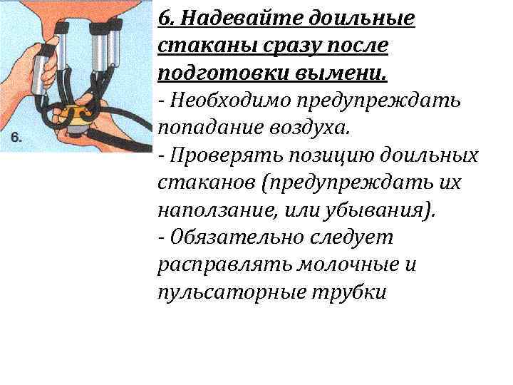 6. Надевайте доильные стаканы сразу после подготовки вымени. - Необходимо предупреждать попадание воздуха. - Проверять позицию доильных стаканов (предупреждать их наползание, или убывания). - Обязательно следует расправлять молочные и пульсаторные трубки