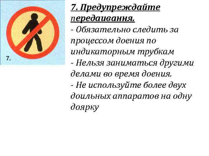 7. Предупреждайте передаивання. - Обязательно следить за процессом доения по индикаторным трубкам - Нельзя заниматься другими делами во время доения. - Не используйте более двух доильных аппаратов на одну доярку