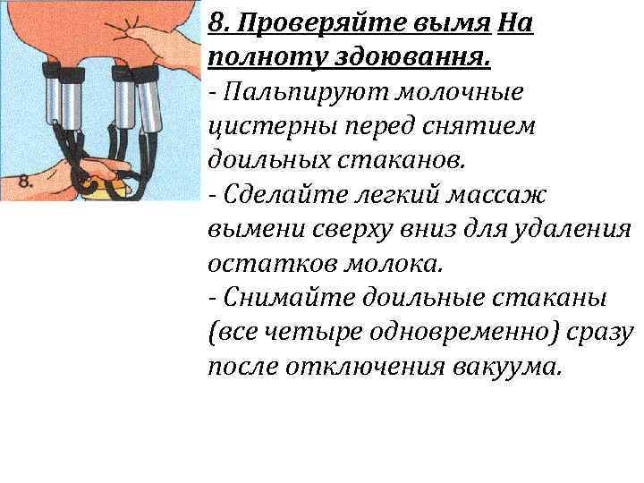 8. Проверяйте вымя На полноту здоювання. - Пальпируют молочные цистерны перед снятием доильных стаканов. - Сделайте легкий массаж вымени сверху вниз для удаления остатков молока. - Снимайте доильные стаканы (все четыре одновременно) сразу после отключения вакуума.