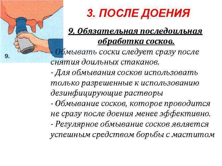 3. ПОСЛЕ ДОЕНИЯ 9. Обязательная последоильная обработка сосков. - Обмывать соски следует сразу после снятия доильных стаканов. - Для обмывания сосков использовать только разрешенные к использованию дезинфицирующие растворы - Обмывание сосков, которое проводится не сразу после доения менее эффективно. - Регулярное обмывание сосков является успешным средством борьбы с маститом