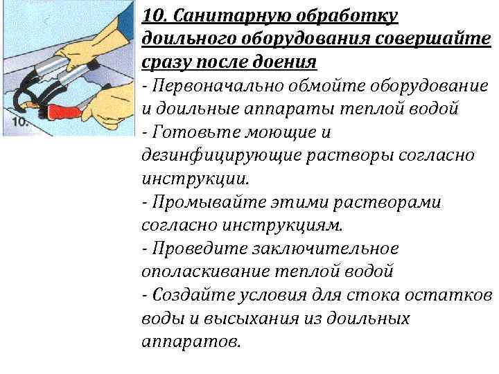 10. Санитарную обработку доильного оборудования совершайте сразу после доения - Первоначально обмойте оборудование и доильные аппараты теплой водой - Готовьте моющие и дезинфицирующие растворы согласно инструкции. - Промывайте этими растворами согласно инструкциям. - Проведите заключительное ополаскивание теплой водой - Создайте условия для стока остатков воды и высыхания из доильных аппаратов.