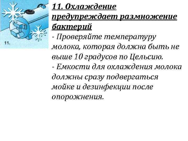 11. Охлаждение предупреждает размножение бактерий - Проверяйте температуру молока, которая должна быть не выше 10 градусов по Цельсию. - Емкости для охлаждения молока должны сразу подвергаться мойке и дезинфекции после опорожнения.