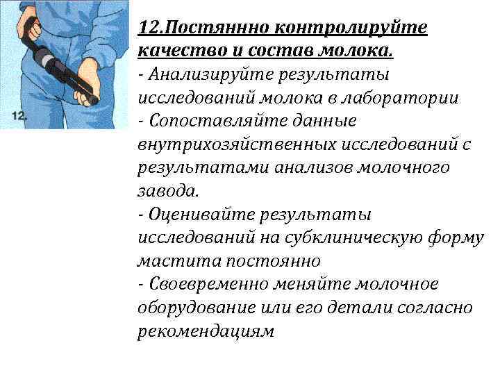 12. Постяннно контролируйте качество и состав молока. - Анализируйте результаты исследований молока в лаборатории - Сопоставляйте данные внутрихозяйственных исследований с результатами анализов молочного завода. - Оценивайте результаты исследований на субклиническую форму мастита постоянно - Своевременно меняйте молочное оборудование или его детали согласно рекомендациям