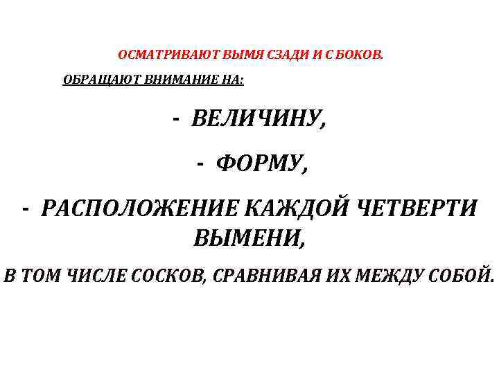 ОСМАТРИВАЮТ ВЫМЯ СЗАДИ И С БОКОВ. ОБРАЩАЮТ ВНИМАНИЕ НА: - ВЕЛИЧИНУ, - ФОРМУ, - РАСПОЛОЖЕНИЕ КАЖДОЙ ЧЕТВЕРТИ ВЫМЕНИ, В ТОМ ЧИСЛЕ СОСКОВ, СРАВНИВАЯ ИХ МЕЖДУ СОБОЙ.