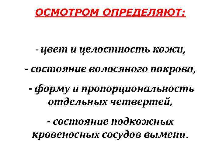 ОСМОТРОМ ОПРЕДЕЛЯЮТ: - цвет и целостность кожи, - состояние волосяного покрова, - форму и пропорциональность отдельных четвертей, - состояние подкожных кровеносных сосудов вымени.