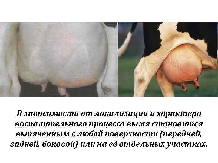 В зависимости от локализации и характера воспалительного процесса вымя становится выпяченным с любой поверхности (передней, задней, боковой) или на её отдельных участках.