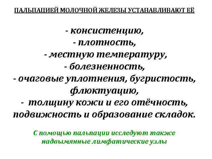ПАЛЬПАЦИЕЙ МОЛОЧНОЙ ЖЕЛЕЗЫ УСТАНАВЛИВАЮТ ЕЁ - консистенцию, - плотность, - местную температуру, - болезненность, - очаговые уплотнения, бугристость, флюктуацию, - толщину кожи и его отёчность, подвижность и образование складок. С помощью пальпации исследуют также надвымянные лимфатические узлы