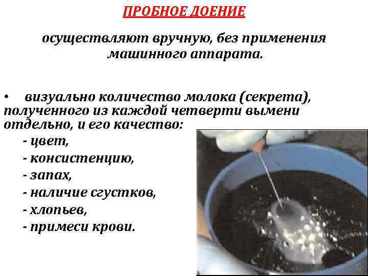 ПРОБНОЕ ДОЕНИЕ осуществляют вручную, без применения машинного аппарата. • визуально количество молока (секрета), полученного из каждой четверти вымени отдельно, и его качество: - цвет, - консистенцию, - запах, - наличие сгустков, - хлопьев, - примеси крови.